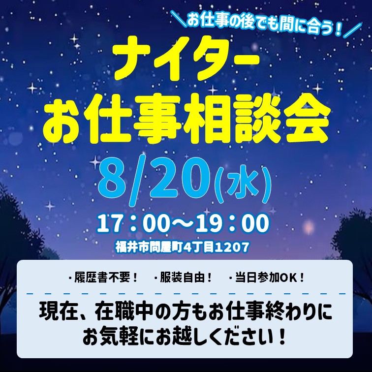 ホーム ★ナイターお仕事相談会★ 2025年 08月15日 ★ナイターお仕事相談会★ 🌙ナイターお仕事相談会のお知らせ🌙 \医療関係の求人が沢山あります♪/ 前のページに戻る ご質問・ご相談など、 お気軽にお問い合わせください 【受付時間】9:00〜18:00 (土・日・祝日を除く) お問い合わせフォームへ メールでのお問い合わせは24時間受付中