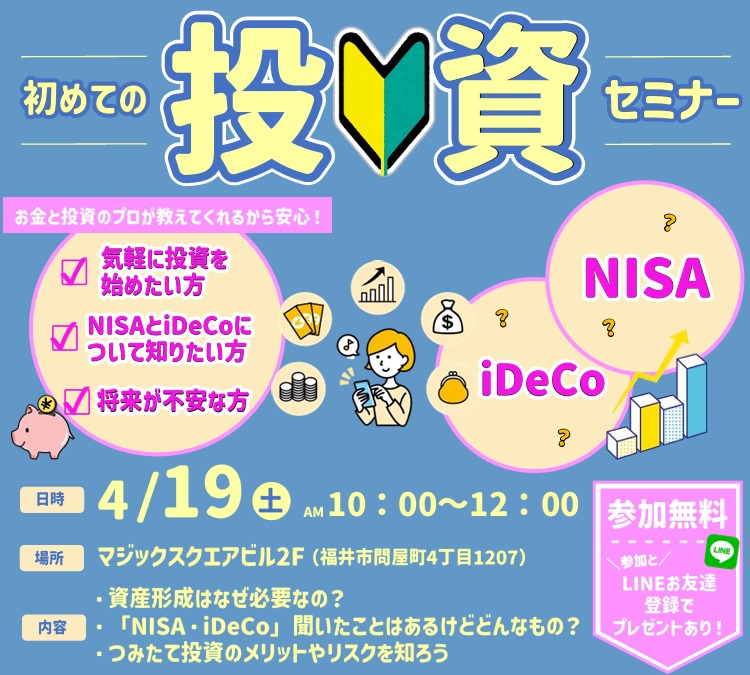 - 4月19日 初めての方向け!お金と投資のプロによる〈投資セミナー〉開催します♪